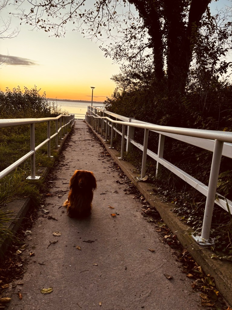 „Der Morgen bricht sanft über der Ostsee an, der Horizont glüht in zarten Pastelltönen, während die ersten Sonnenstrahlen das Meer berühren. Die Welt scheint still zu atmen, nur das leise Rauschen der Wellen begleitet den Beginn dieses neuen Tages. Neben mir liegt mein treuer Hund, sein warmes Fell strahlt Geborgenheit aus. In diesem Moment, während der Himmel sich in Rosa und Gold verfärbt, erfüllt mich eine tiefe Sehnsucht nach der unendlichen Ruhe, nach der Stille, die nur die Natur schenkt. Gemeinsam, Hand in Pfote, sind wir einfach nur da – im Einklang mit dem Augenblick“