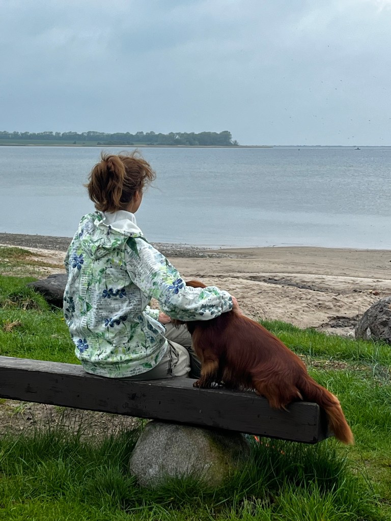 Daniela meinte, mit Hundebox im Wohnmobil, das geht nicht, zu eng. Also bekam ich jetzt einen Anschnallgurt und durfte auf den Beifahrersitz.