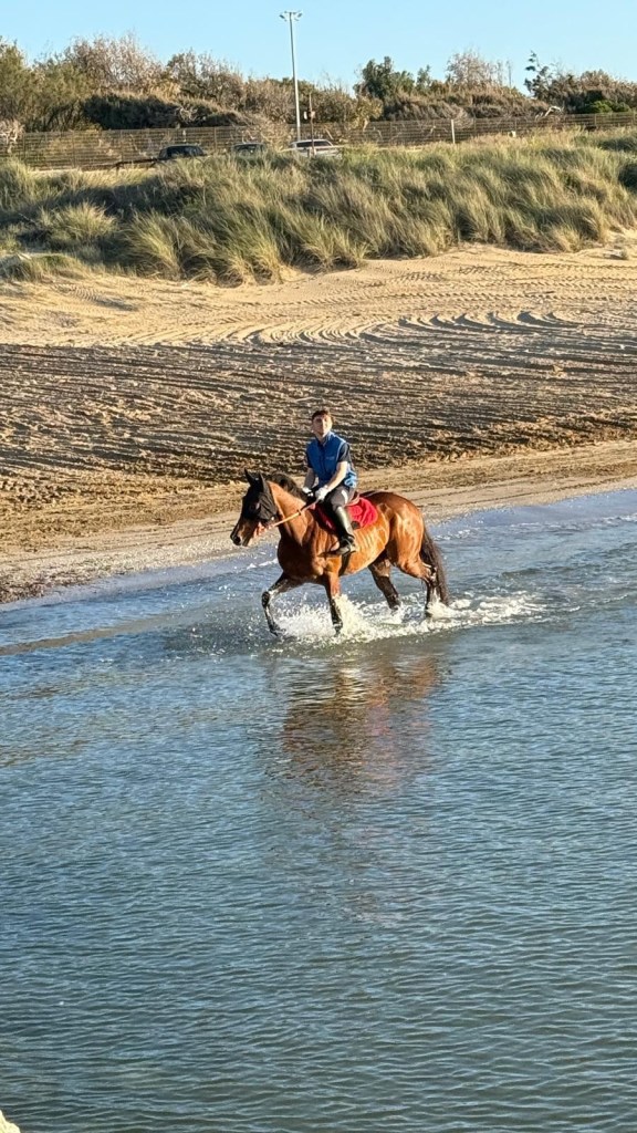 Wir sitzen auf den weißen Felsen und schauen den Reitern zu und genießen den Sonnenuntergang. Es ist in der Sonne sehr warm